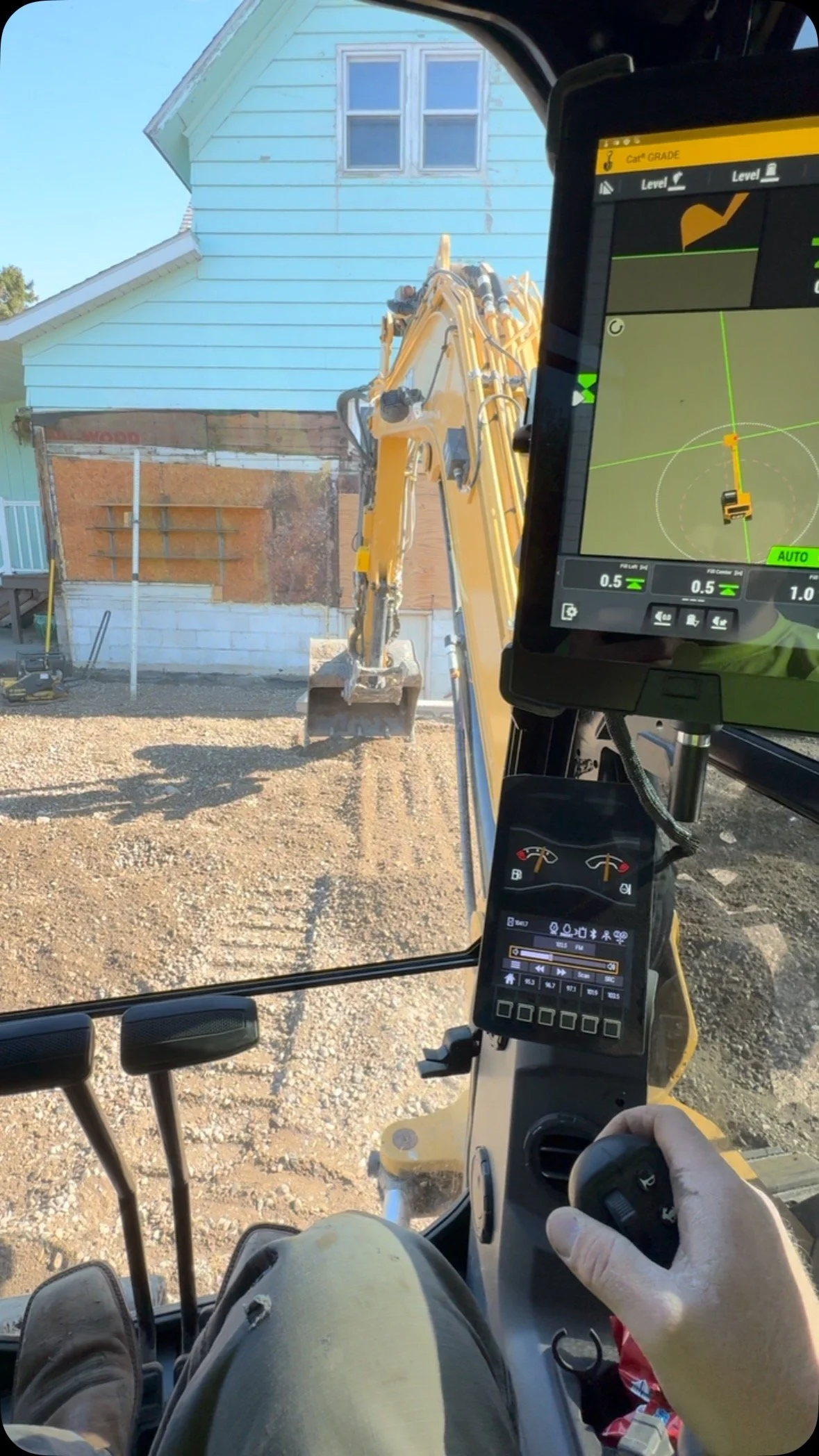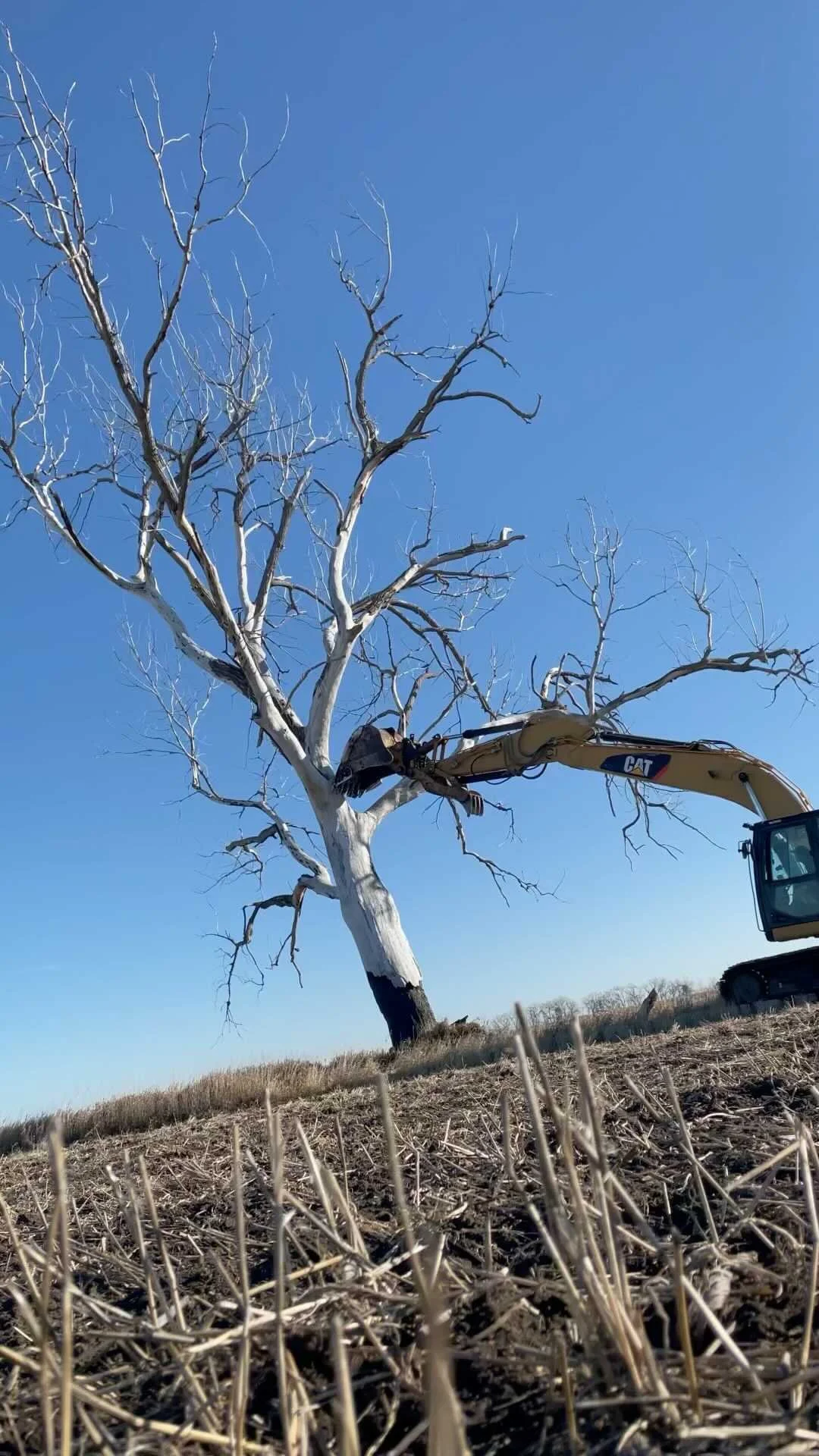 A red semi-truck hauling a load of dirt on a construction site under partly cloudy sky, with a row of trees in the background.